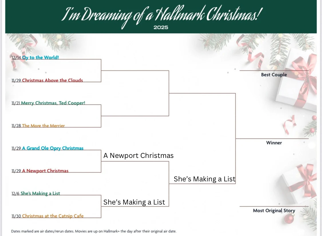 Gretchen Weiners is back at the Hallmark girl and she has to decide some “list” issues. This is also up against Catnip Cafe on our bracket, which I loved for the originality of bringing in cats at Christmas.